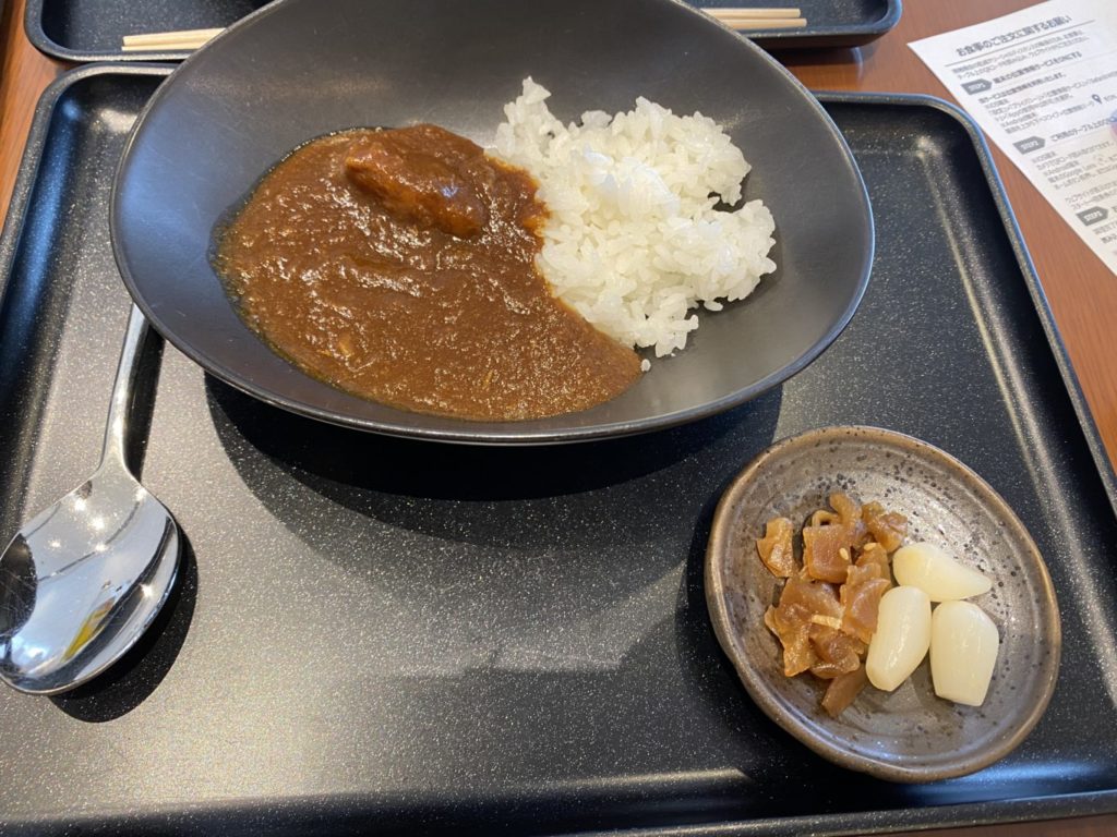 JAL特製オリジナルビーフカレーです。JALの食事と言ったらこれですね、特製カレー。味は甘目ながらもスパイスの香りがしっかりと香ります。特にカルダモンの香りが強いですかね。ゴロっと大きい肉も入っており、名物に相応しい味です。