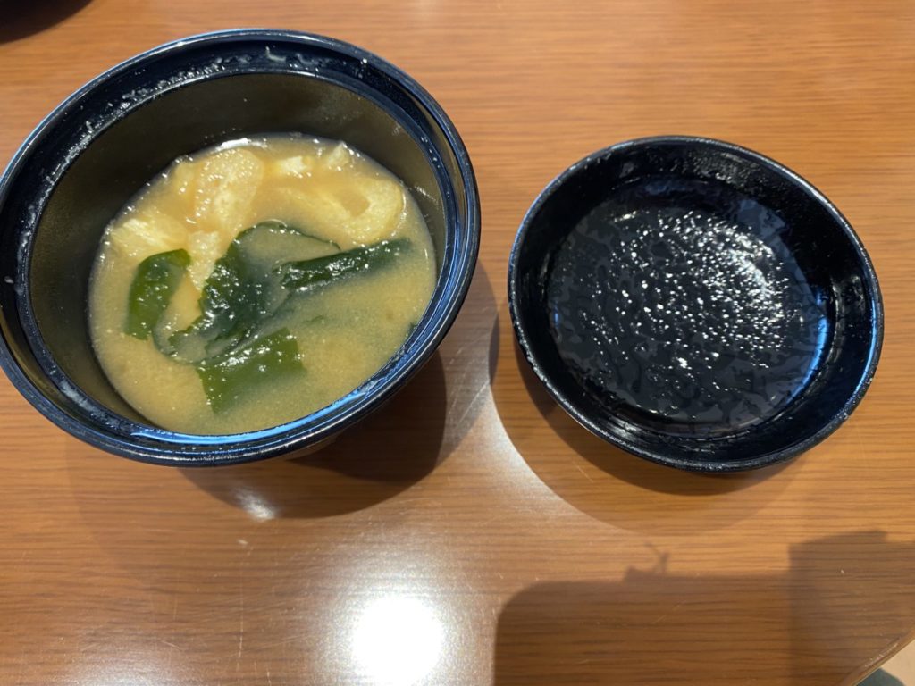 味噌汁、普通の味ですが油揚げとワカメがたっぷり。