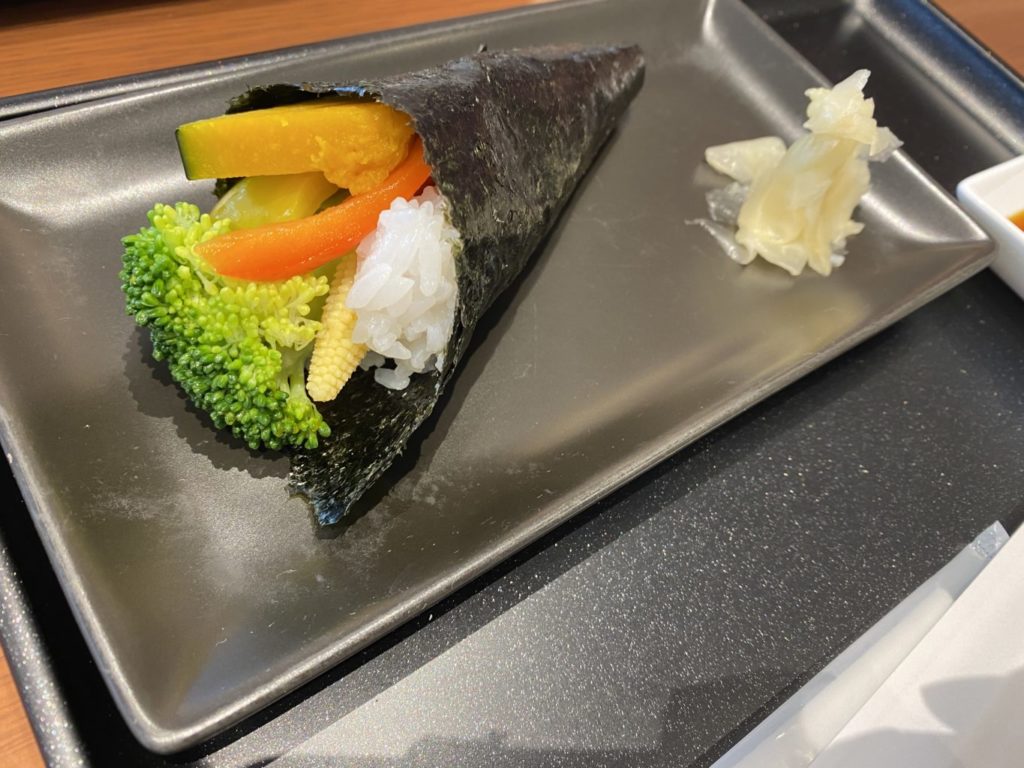 何故か頼んだベジタブルロール。温野菜プレートの野菜達を巻いた手巻き寿司ですが、これを醤油で食べろって!?出来らぁっ!味はまあ意外と悪くないですが、醤油よりもマヨ系の方が良い気がしますね。