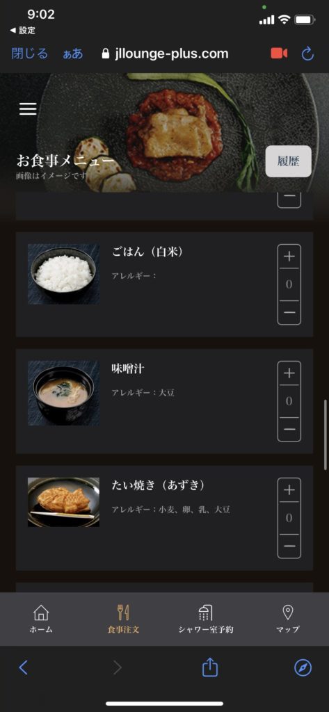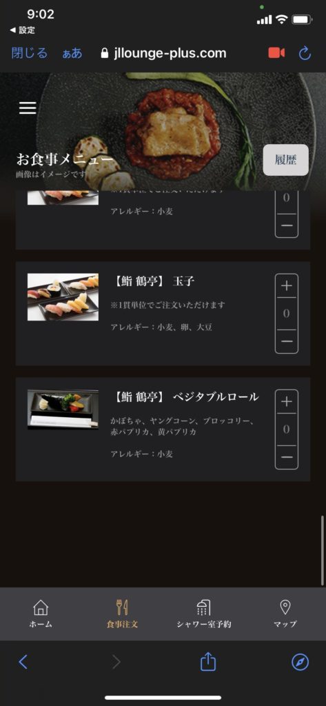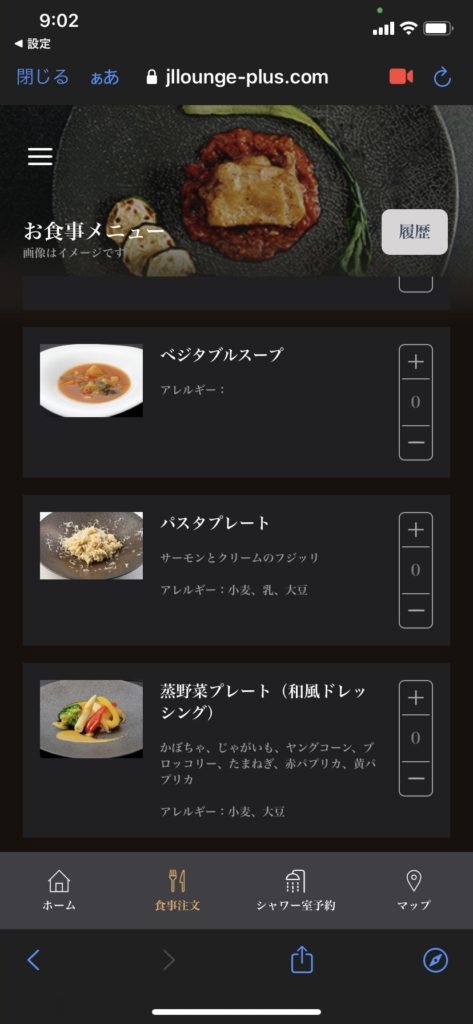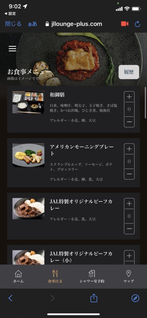 ラウンジの食事というとビュッフェ形式を想像しますが、JALファーストクラスラウンジでは基本的にオーダー形式とのこと。各テーブルにQRコードがあり、それを読み込むとメニューが出てきます。