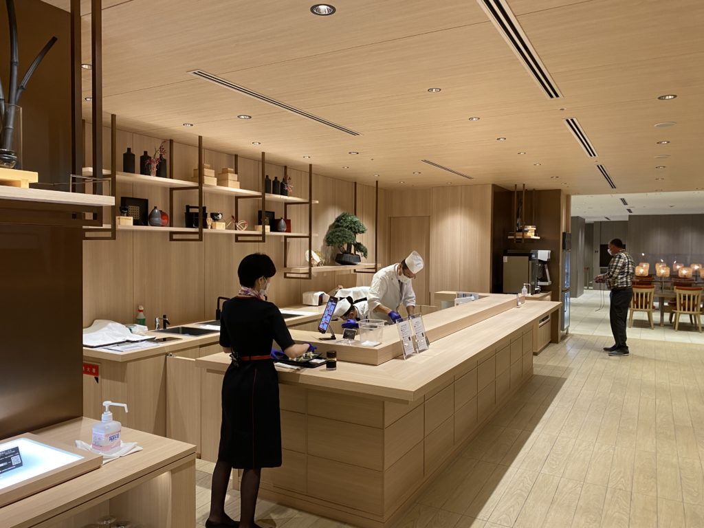 オーダーを終えた後にラウンジ内を探検すると、まさかの寿司カウンターを発見。どうやら、寿司をオーダーすると1カンずつ手で握るとのこと。これがファーストクラスラウンジ・・・恐ろしや・・・