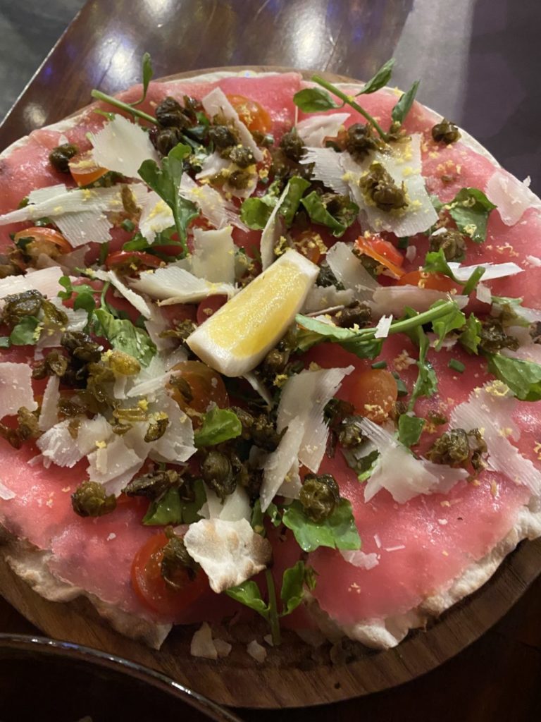 こちらは「Carpaccio di Tonno Croccante」という料理です。中に空洞を作りサクサクに焼いたパンの上にスライスしたマグロやチーズ、アイオリソースをかけたものです。これは美味しい、サクサクと軽いのですが味は濃厚で酒が進みます。おススメです。