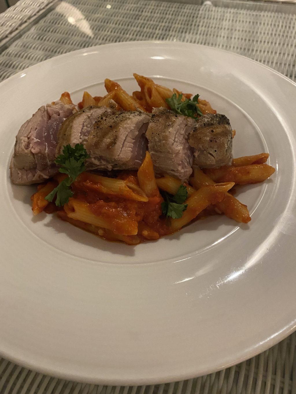 注文してから1時間15分経過、漸く到着です。Tuna Penneの名の通り、ペンネ・アラビアータの上に炙った鮪のタタキが乗っています。ペンネと鮪の組み合わせが良いのかはさて置き、どちらも単体で食べると中々美味しい。不味かったならば怒りを爆発させることが出来たのに、残念?ながらそこそこ美味しく、怒りが少し治まりました。