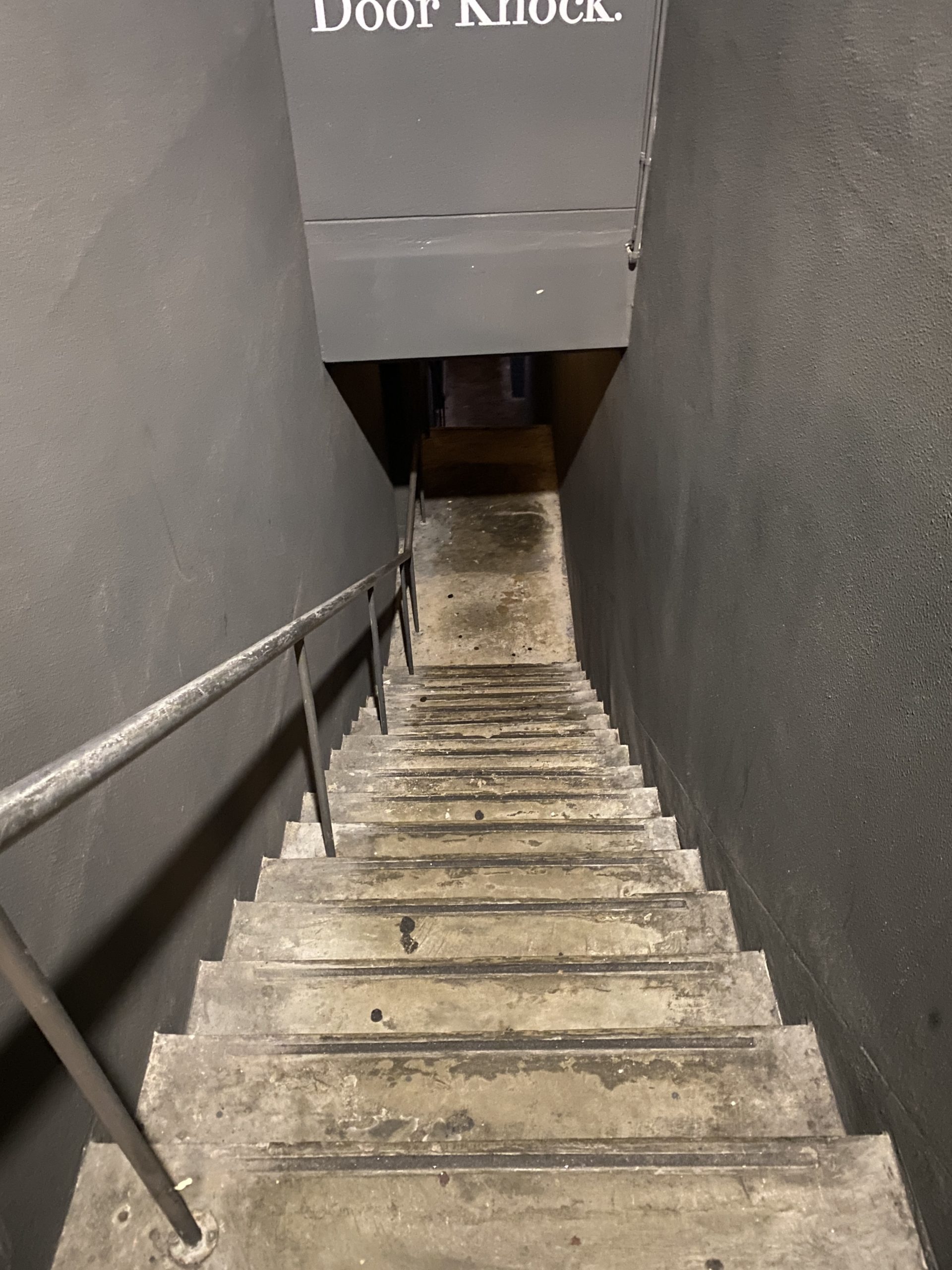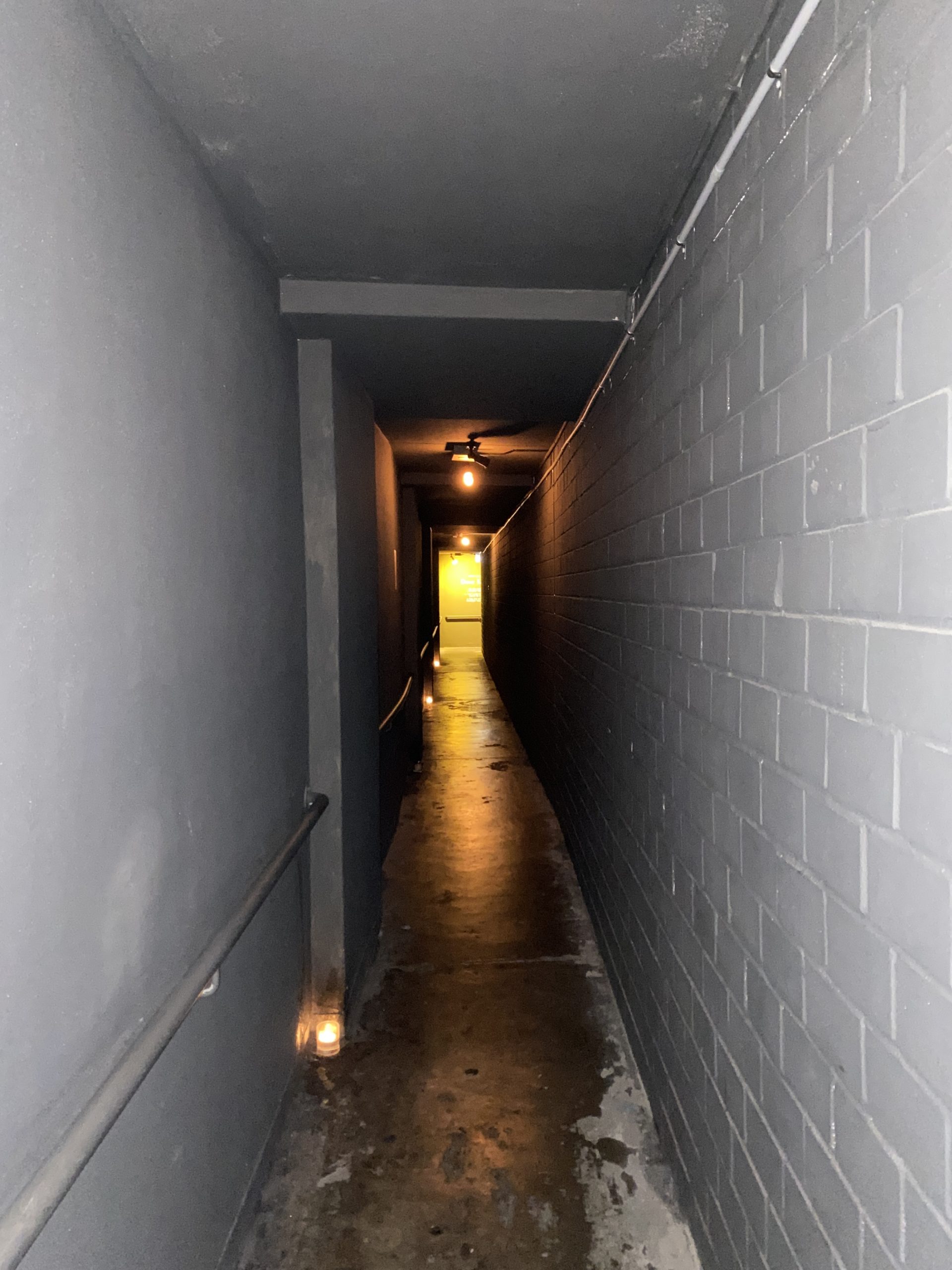 雑居ビルの地下に降りた後、50m程の薄暗い廊下を歩いていきます。怖すぎワロタ。