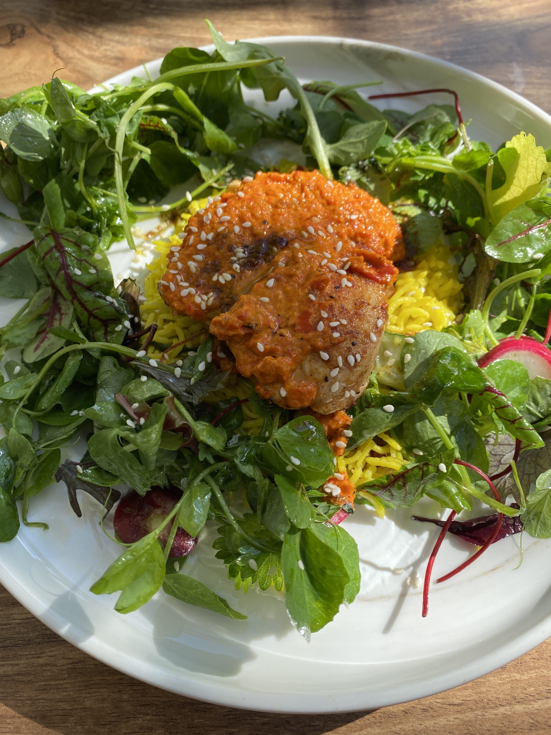 メニューの名前は忘れましたが、ターメリックで色付けされたライスの上にスパイシーな味付けのチキンが乗っている品。