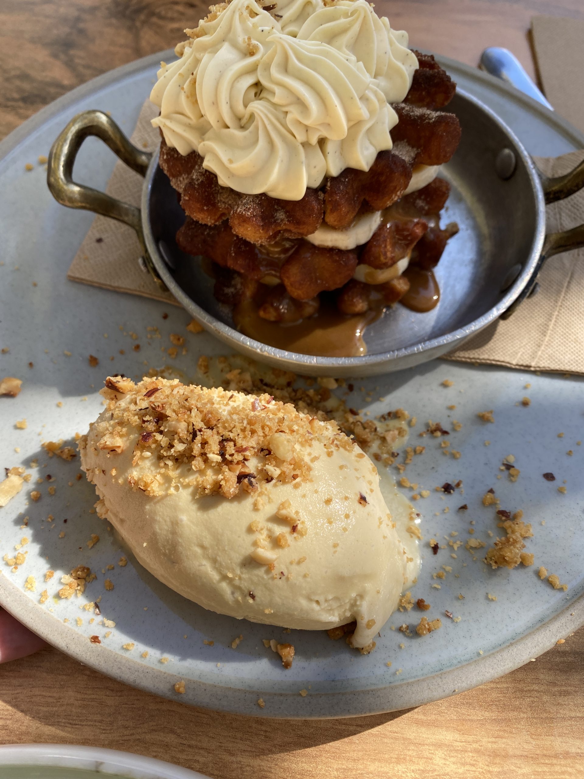 妻が頼んだのはBANOFFEE WAFFLE、これは美味しいですね~。カリッと焼かれたワッフルはシナモンがたっぷり。ワッフル単体だと甘さは控えめなのですが、付け合わせのキャラメルアイスを付けると非常に丁度良い甘さになります。人生でもトップクラスに美味しいワッフルでした。