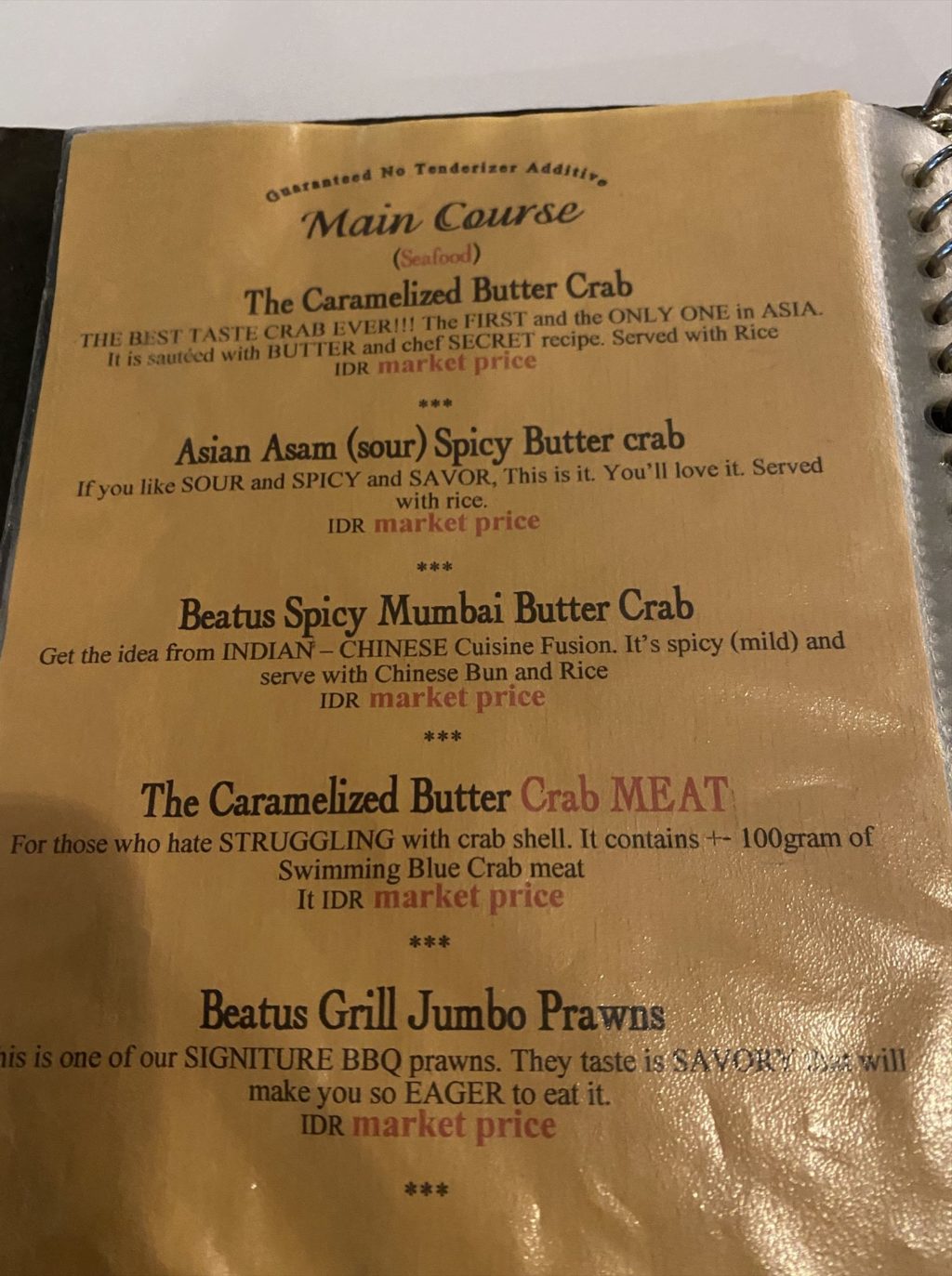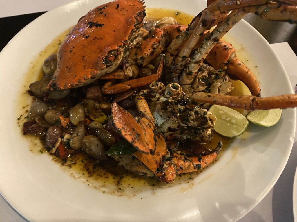 事前情報で蟹以外はマジで大したことないという話を聞いていたので、初っ端からフルスロットルで目当ての蟹をオーダーします。調理方法はいくつかあるのですが、これまたおススメされたCaramelized Butter Crabにしました。注文時に辛さと肉の種類(多分ベーコン、豚or牛でした)を聞かれるので、お好みを伝えましょう。因みに、蟹は仕入れ状況がマチマチらしいので、必ず事前に予約をして蟹を食べたい旨を伝えましょう。