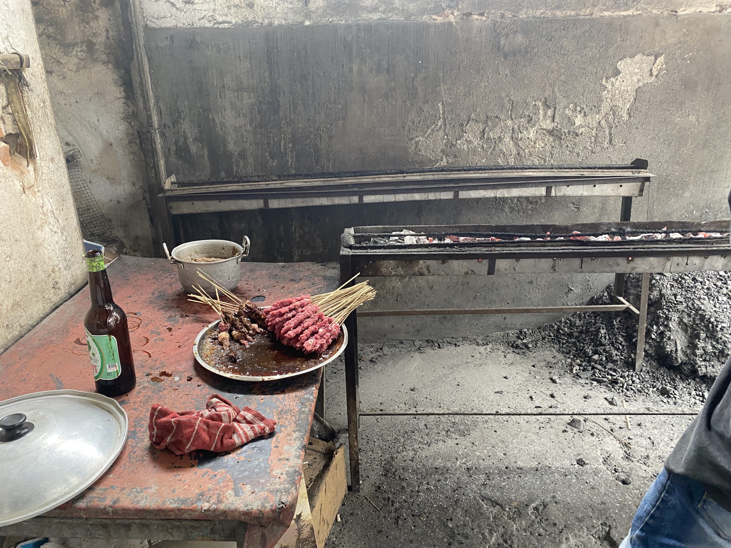 写真撮ったらおじさんがポーズ決めてくれました。こちらのお店はカンビン専門店らしく、次々に(恐らく今朝まで生きていたであろう)ヤギ肉を串に刺しています。