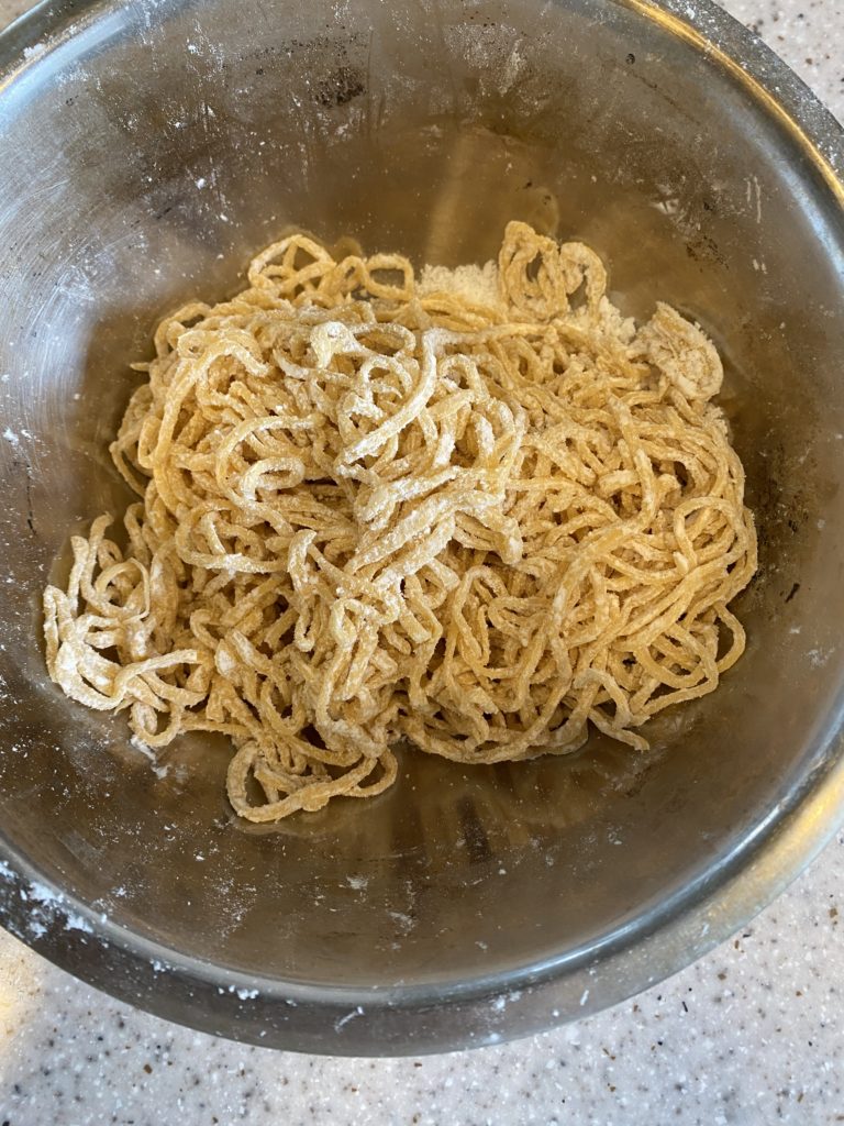 ③パスタマシンで製麺、厚さはメモリ4です。加水率が高めなので十分に打ち粉をして、中華麺に