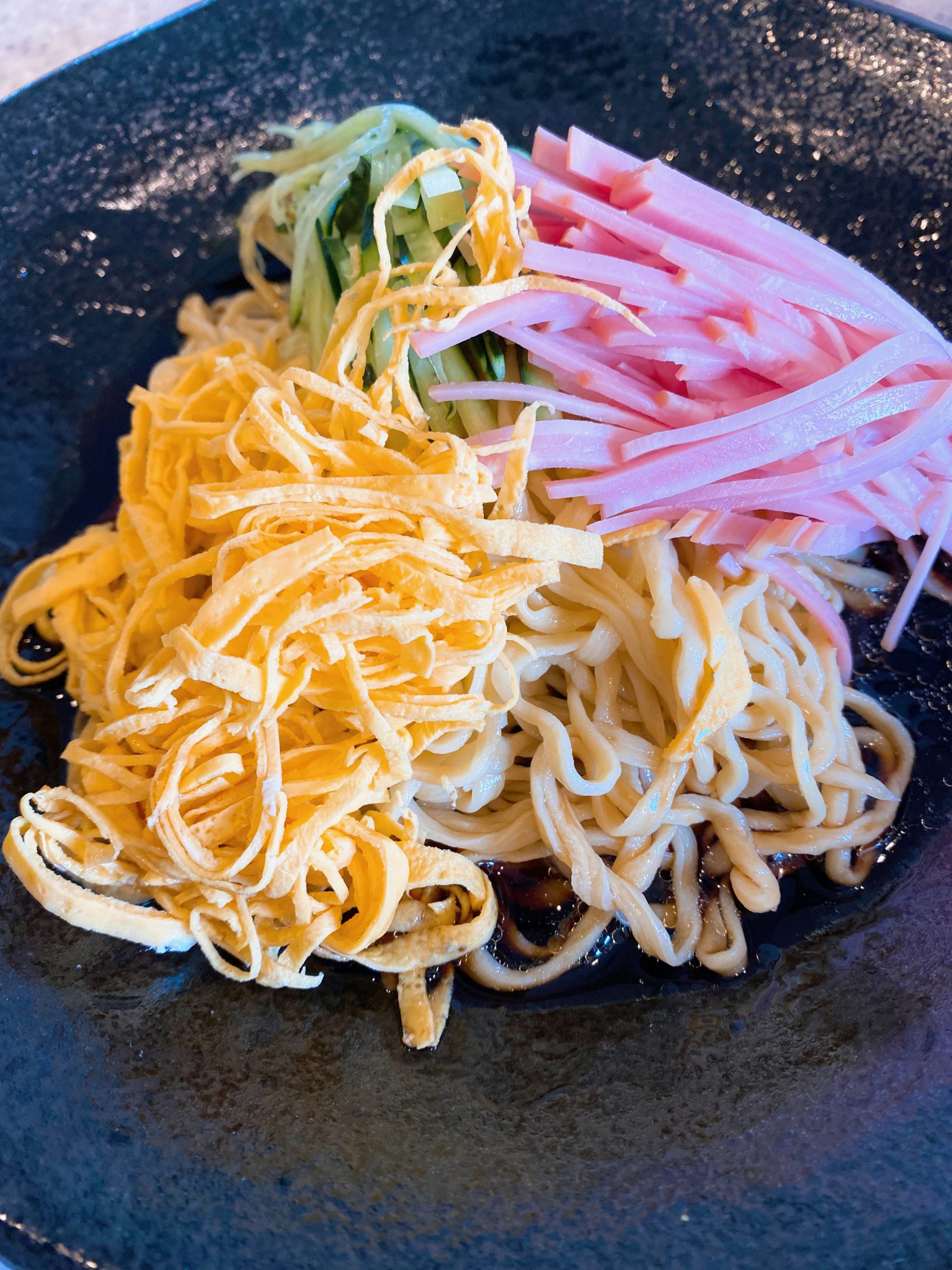 麺は茹でた後にしっかりと水洗いしてヌメリを取り、氷水で冷やす。水をしっかりと切り、盛り付ける。乗せる具はお好みですが、今回は錦糸卵・ハム・キュウリにしました。麺を茹でる際は、冷やして締まるのを計算して少し長めに茹でるのがポイントです。