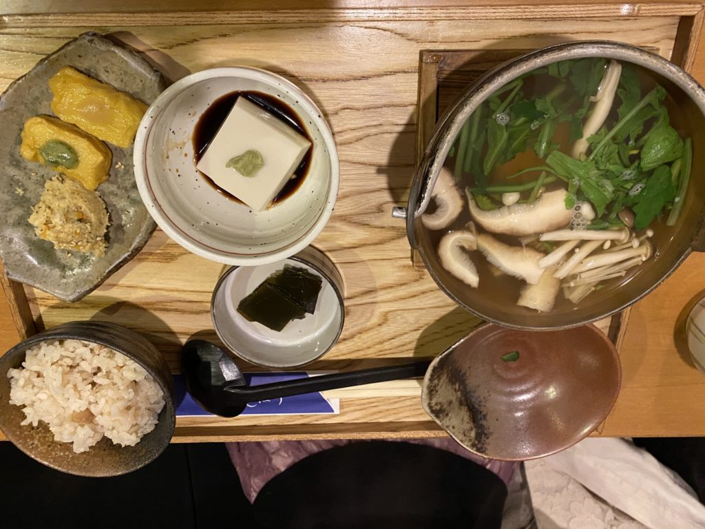 中々のボリュームでした。左上は粟麩に味噌(おそらく酢味噌と木の芽味噌)を乗せて焼いたものとおからでした。中央上側は胡麻豆腐、中央下側は昆布の佃煮、ご飯は大豆ご飯です。胡麻豆腐鍋が美味しいですね~、胡麻豆腐を鍋にすると美味しいというのは知りませんでした。胡麻豆腐自体も非常に美味しいです。月並みな表現ですが、スーパーで売っている胡麻豆腐とはレベルが違います。