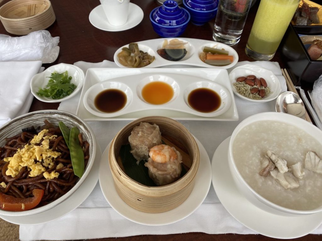 コンチネンタルブレックファストです。流石香港系のホテル、朝食のメニューに中華があるのが面白いです。中華粥・焼きそば・焼売という布陣です。中華粥の具はカニ・白身魚・鶏の3種類から選択可能で、今回は白身魚を選びました。中華粥は出汁が効いており美味しいですが、ちょっと米の割合が多すぎますね。中華粥はもっとサラサラの方が好きでした。焼きそばはちょっと油がキツイですね~。焼売は美味しいです。中華粥の付け合わせで香菜・ピータン・ザーサイがあるのは嬉しいです。