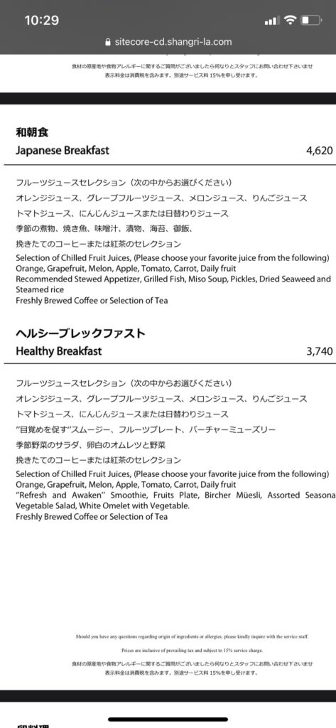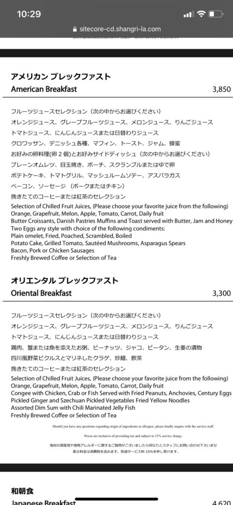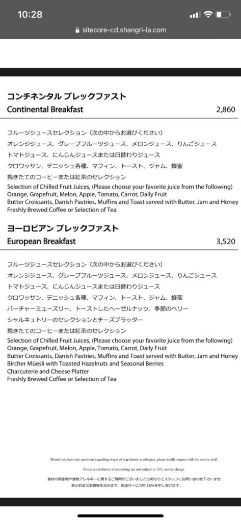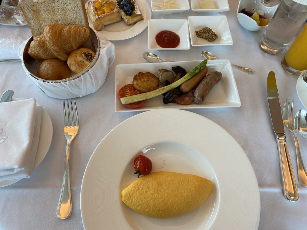 さてさて、一夜明け朝食です。朝食は土日であればインルームダイニングとメインダイニングを選択可能、平日はインルームダイニングのみです。今回は2泊ともインルームダイニングにしたので、2日分を纏めて紹介します。